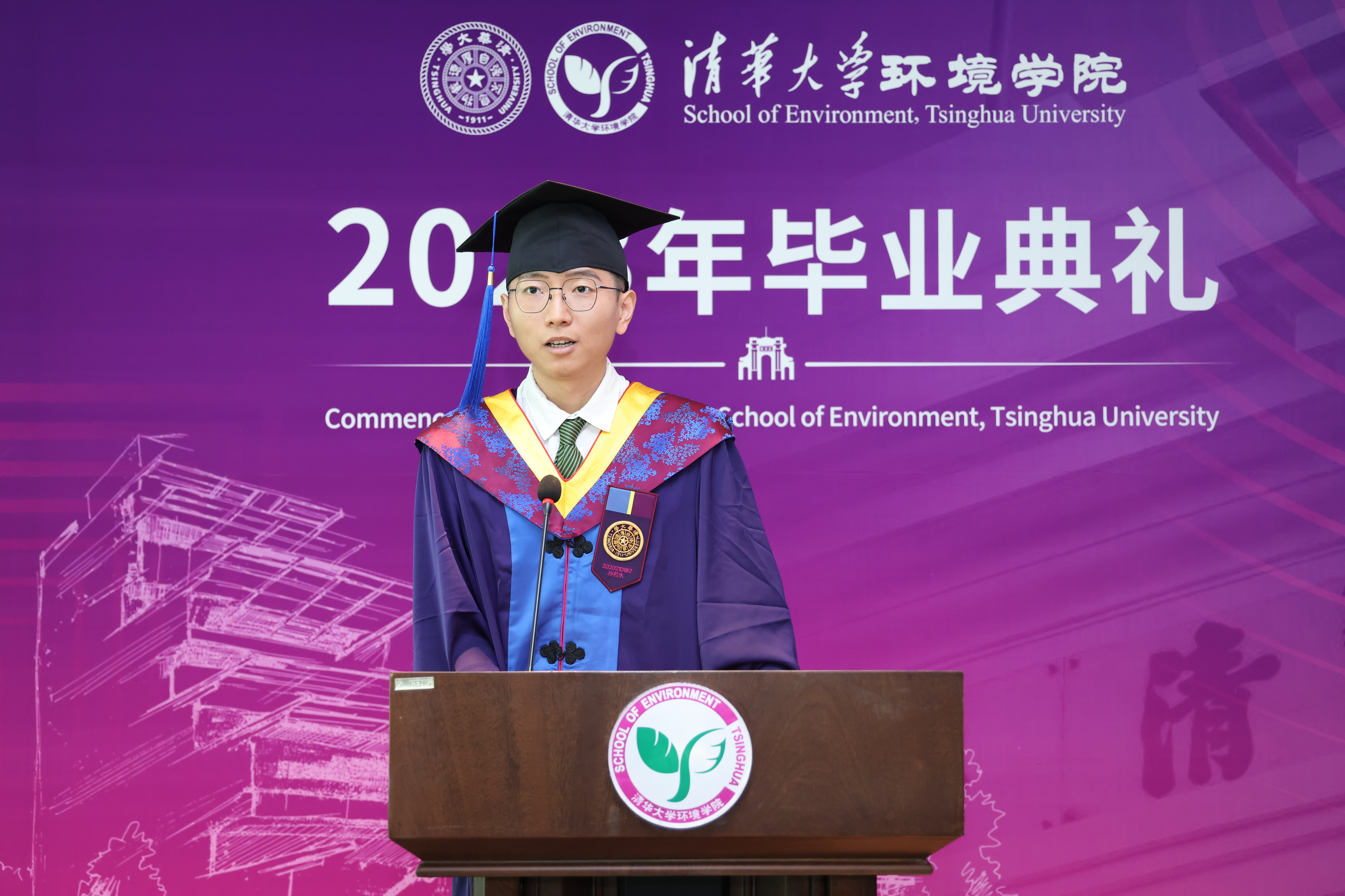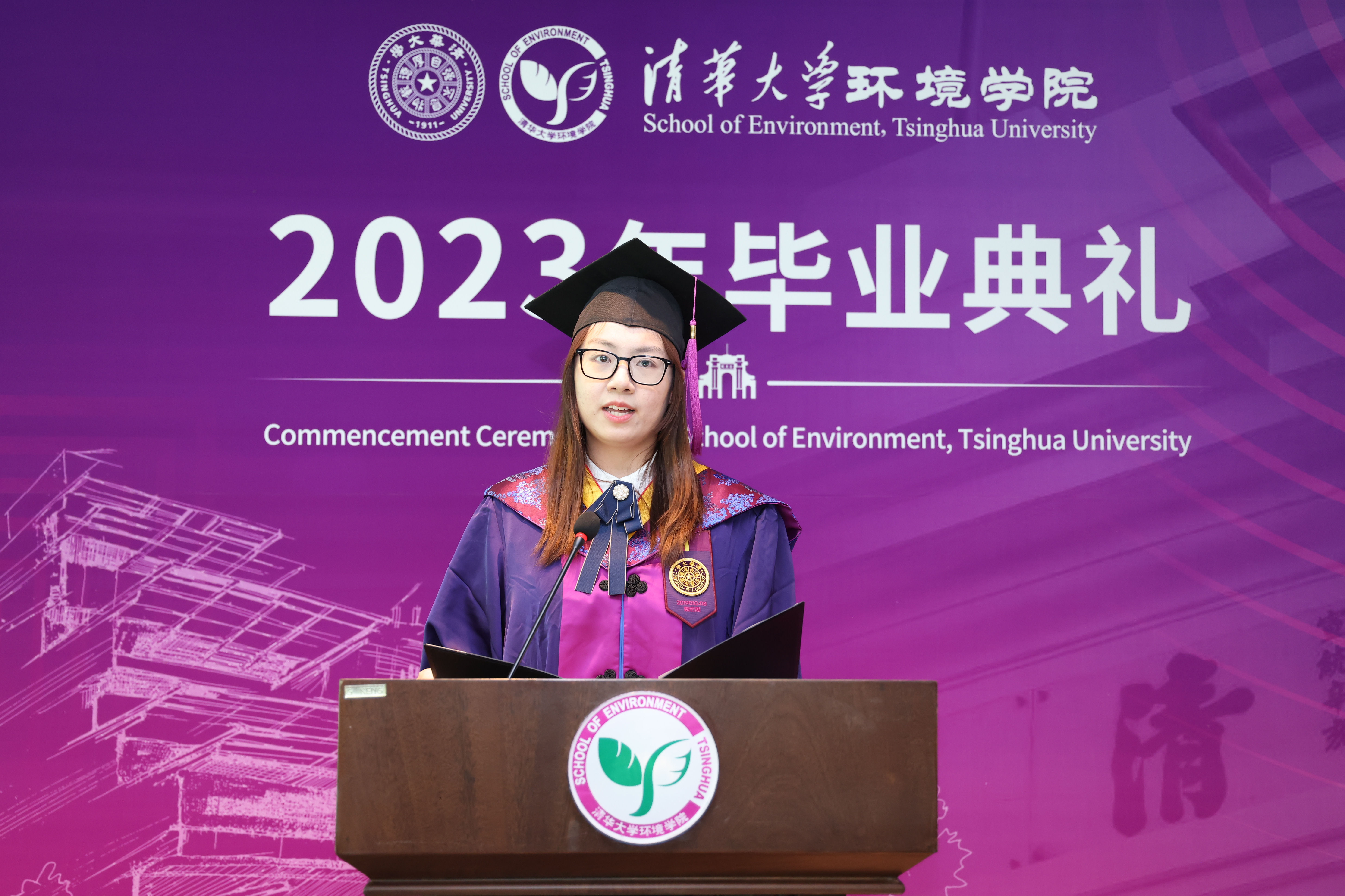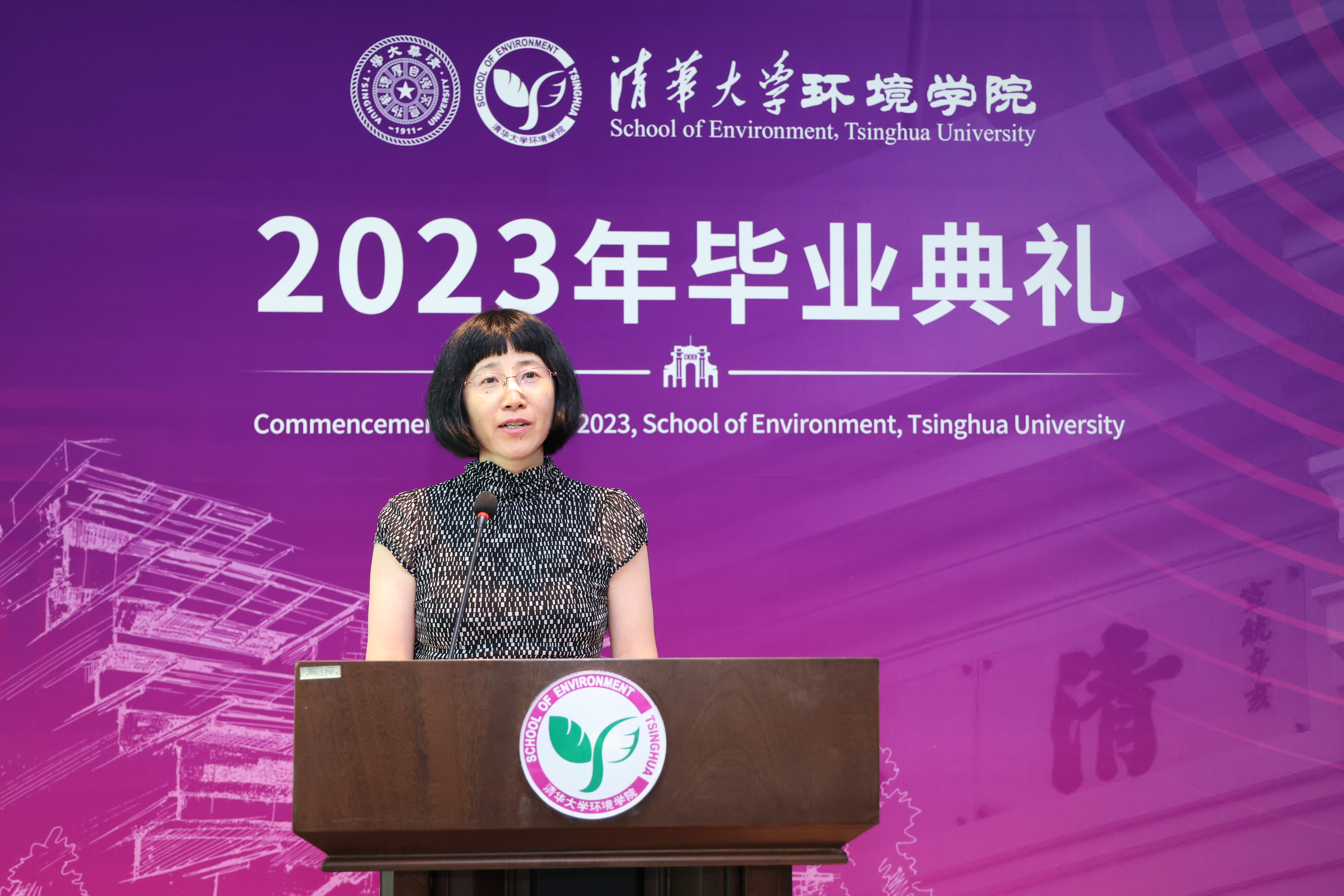1991级校友、浙江清华长三角研究院生态环境研究所所长刘锐为毕业生献上寄语。她分享了自己多年来的学习及工作故事,强调既要“仰望星空”,又要“脚踏实地”,在解决基层问题中实现自己的价值。她鼓励同学们多深入调研学习,将自身所学贡献于祖国的环境保护事业。