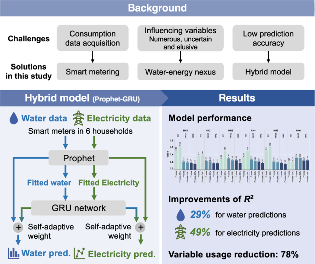 随着人口增长和生活习惯的改变,居民家庭用水、用能量持续上升。预测高时间分辨率的家庭用水、用电量能够加强资源管理、支撑基础设施规划建设、促进资源转型和可持续发展。然而,居民家庭用水-用能行为复杂、数据难以获取、影响因素繁多,现有预测模型需要多种输入数据且准确性较低。研究团队基于北京市海淀区居民家庭的智能监测数据,提出了时间序列模型(Prophet)与深度学习网络(GRU)耦合的混合机器学习算法,揭示了家庭水-能耦合的代理机制。