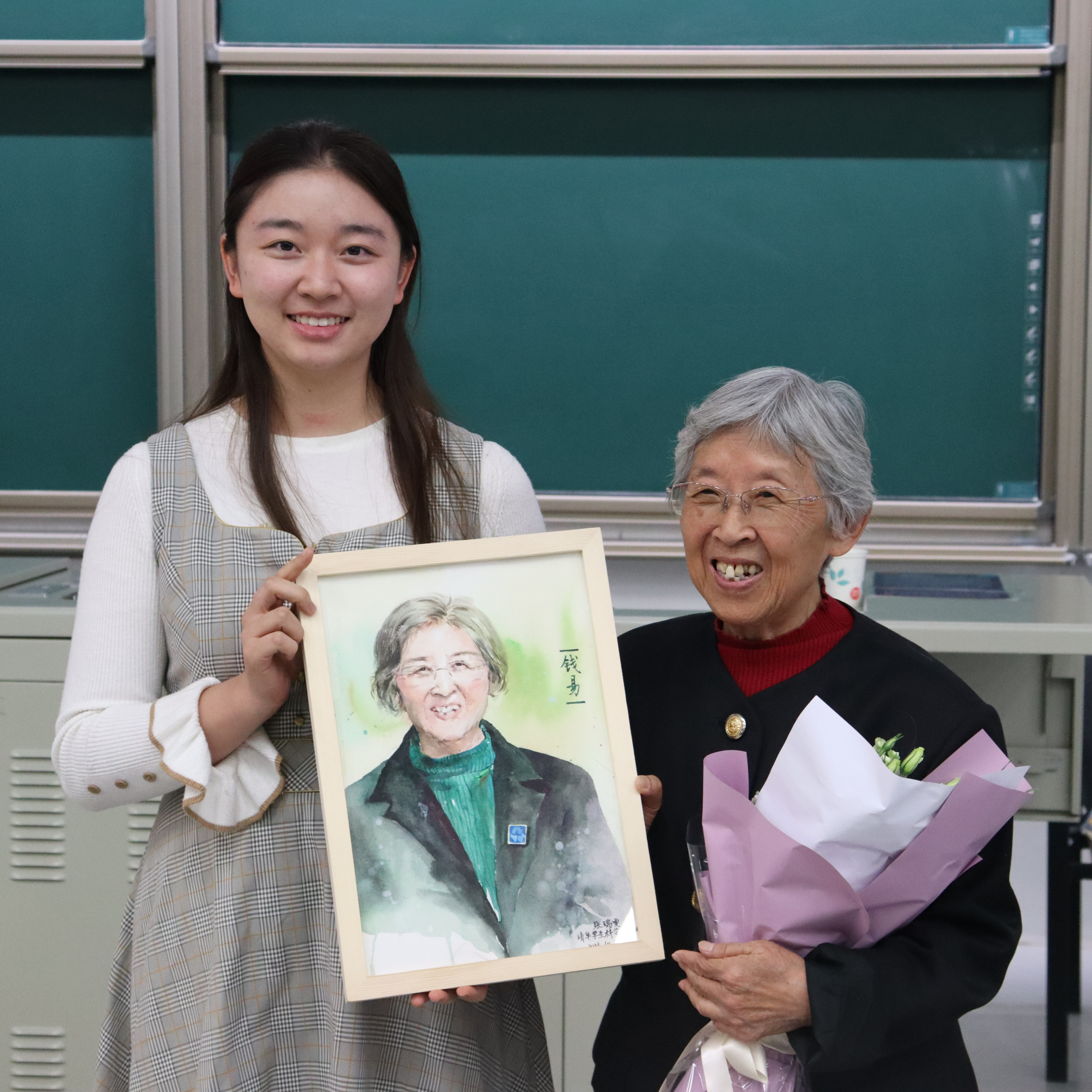最后,袁丽丽老师向钱易先生赠送花束,清华大学美术学院28班学生张瑞雯为老师送上精心准备的画作,向钱易先生表示感谢与敬意。