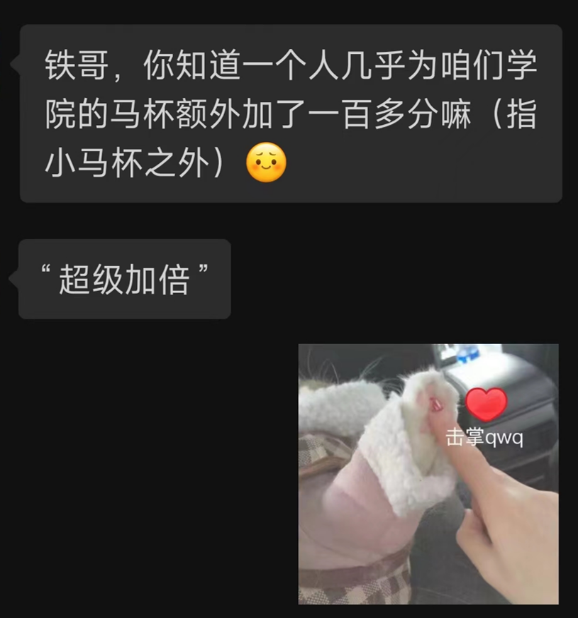 我之前有不少体育竞赛的经历,加入中二队是我刚来清华时就定下的目标之一,希望我能够在热爱的领域和团队中继续奔跑。