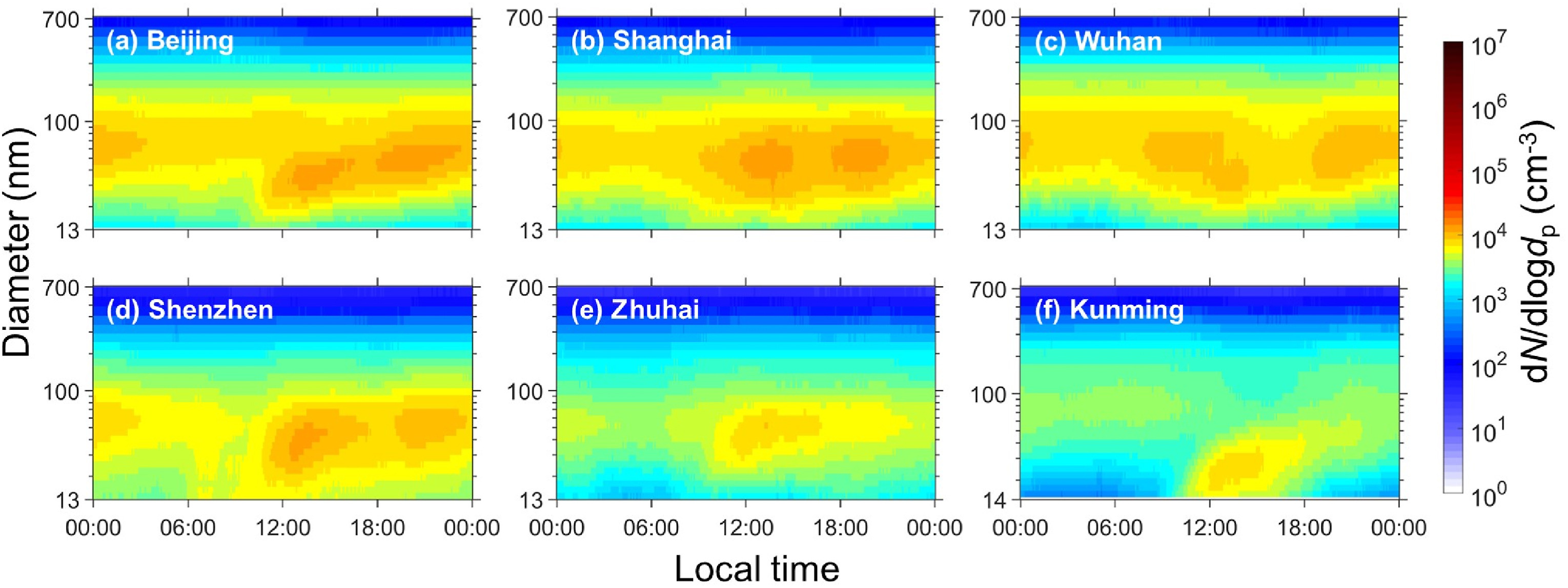 所建立的观测网络持续获得了各地的10-700纳米大气颗粒物粒径分布,与大气颗粒物总数浓度观测结果的比较验证了粒径谱测量结果的准确性。各站点所用的双极电迁移率粒径谱仪实验室标定结果和大气外场比对结果一致性好。同时,该研究发现在六个大气站点的长期观测中,天然离子性质比较稳定,证明了这些站点的天然荷电过程可用于其气溶胶粒径分布的测量。各站点的气溶胶粒径谱呈现出不同的日变化规律。其中,北京、上海和武汉三个城市站点的气溶胶数浓度显著高于深圳、珠海和昆明的三个郊区站点,这也反映了城区人为活动对大气气溶胶的影响。