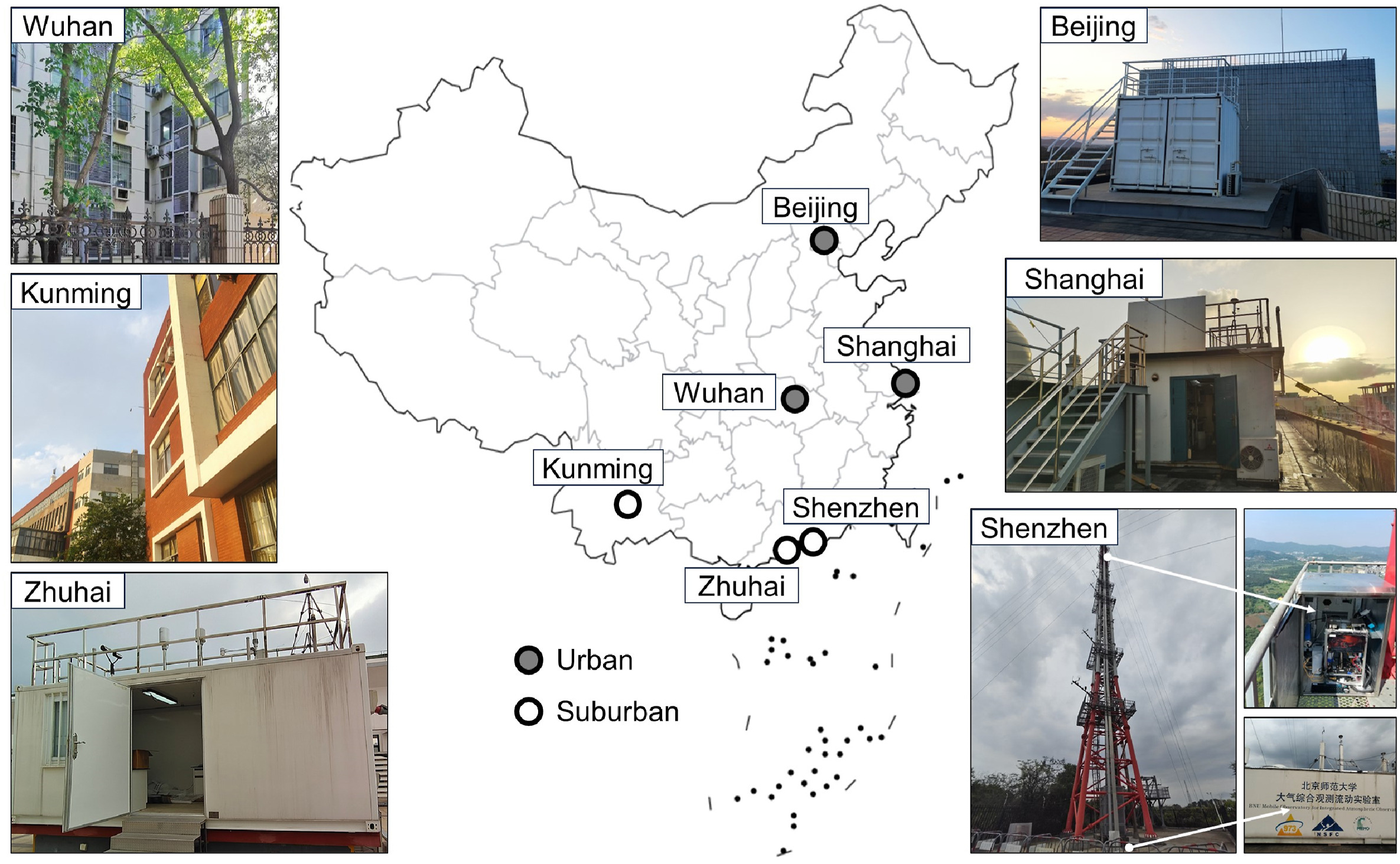 团队自主研发了使用新测量思路和数据分析方法的双极电迁移率粒径谱仪,同多家单位合作,在北京、上海、深圳、武汉、珠海、昆明等地建立了同步在线测量大气气溶胶粒径谱的观测网络,自2023年4月起开始持续运行。这些新仪器使用大气离子对气溶胶的天然荷电代替了传统的人工荷电,并建立了一套包含实验室标定、外场观测比对、数据反演与验证的质控体系,同时显著降低了观测网络的建设和运行成本。