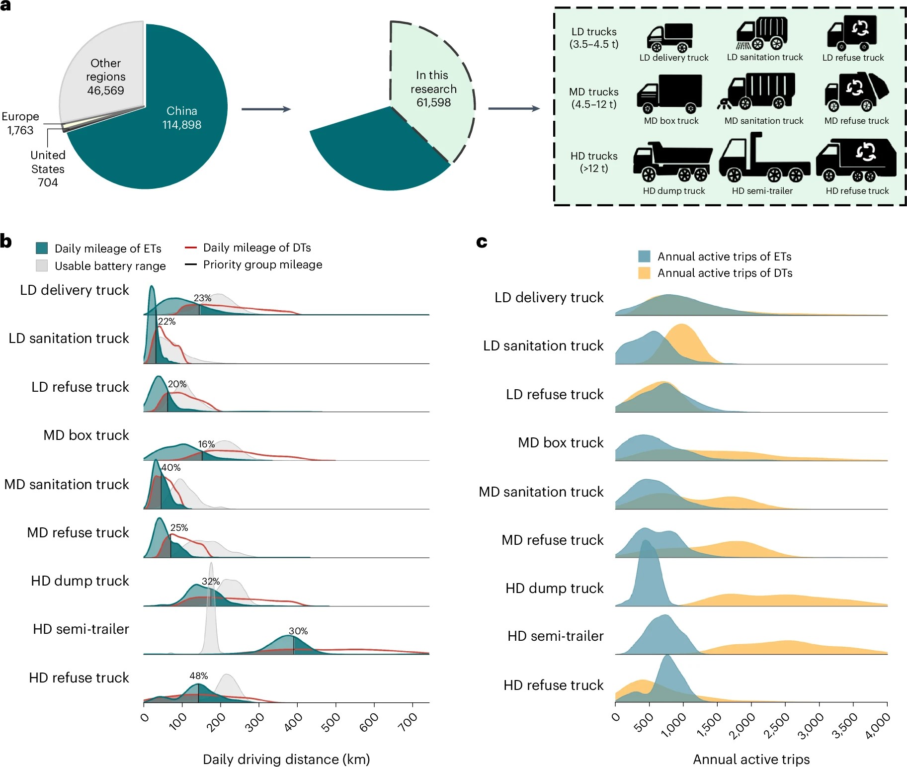 相关研究成果以“基于实际运行大数据发现的货车电动化的挑战和机遇”(Challenges and opportunities in truck electrification unveiled by big operational data)为题,于8月12日发表在《自然·能源》(Nature Energy)上。