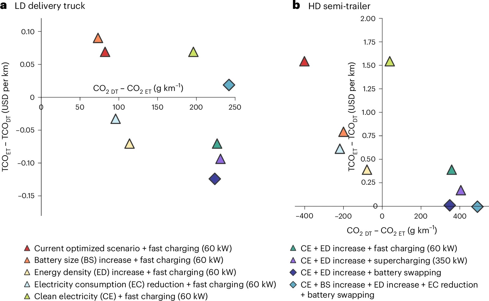 图3. 2030年不同技术能源情景下(a)轻型物流车、(b)重型牵引车全场景电动化的气候和成本效益