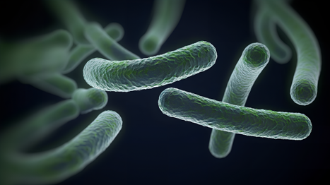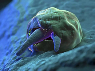图 电子显微镜扫描图像显示贾第虫包囊(底部左侧)和滋养体(底部右侧)(图源:美国 CDC/Stan Erlandsen 博士)