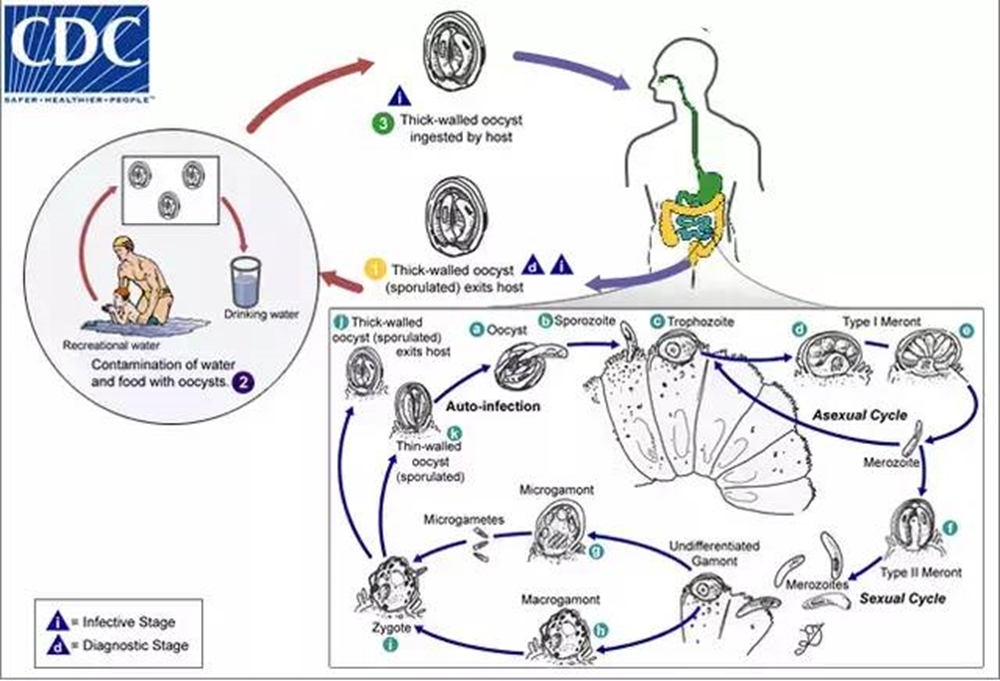 图 隐孢子虫生活史(图源:美国 CDC/Alexander J da Silva 和 Melanie Moser)